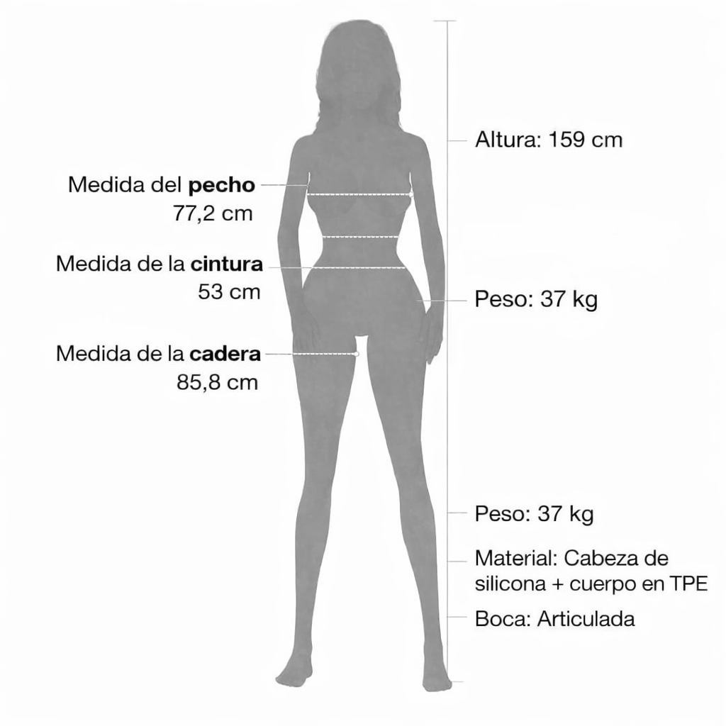 Su cabeza de silicona de alta definición aporta un nivel superior de detalle, mientras que el cuerpo en TPE premium ofrece suavidad y flexibilidad al tacto. El cabello implantado refuerza su apariencia natural, logrando una experiencia visual y táctil cuidada en cada aspecto.